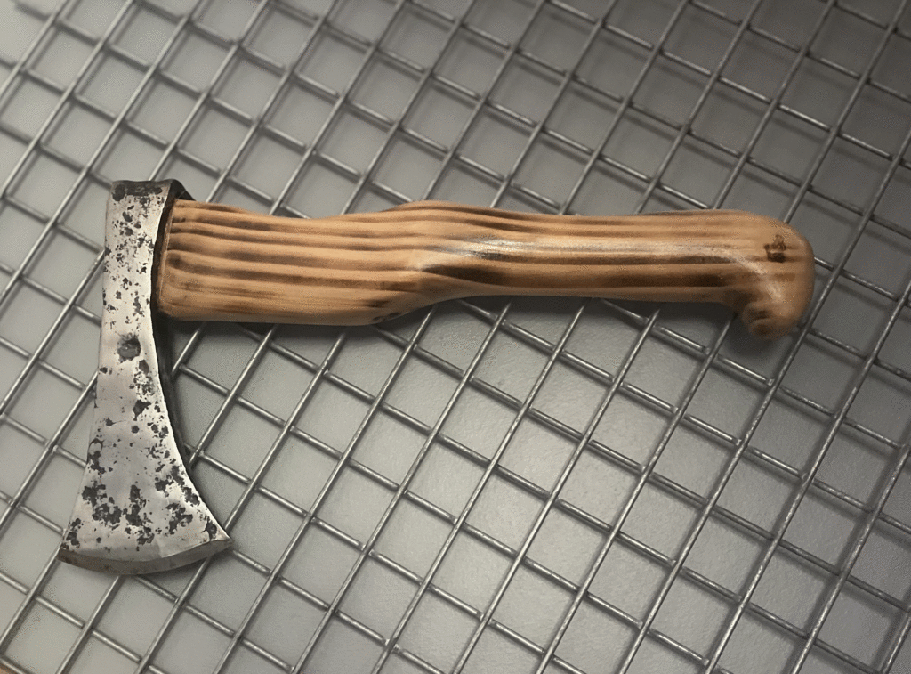 Sculpture d’un manche selon plan client pour la mise en valeur d’une hache ancienne.